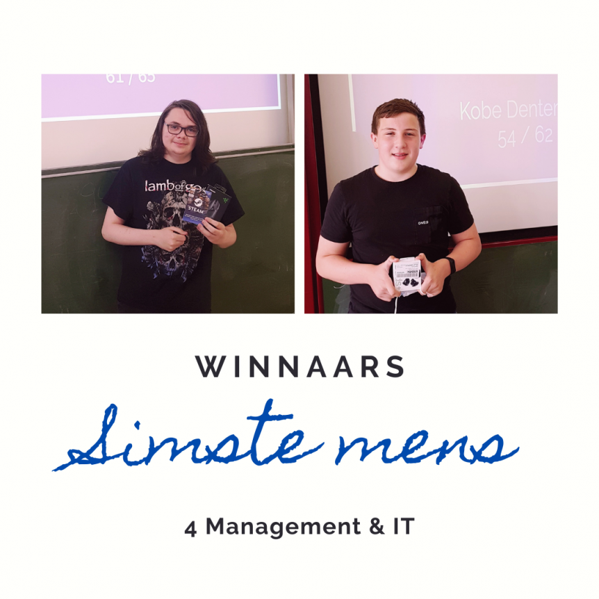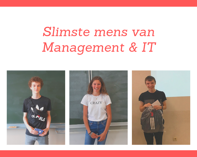 Een heel schooljaar lang werd er om de twee weken gestreden om de slimste mens van de studierichting 4 Management & IT te worden. Gedurende het schooljaar kregen de leerlingen elke vrijdag dat ze op school waren 5 economische actualiteitsvragen voorgeschoteld. De leerling met de meeste juiste antwoorden doorheen deze periode, mag een jaar lang ‘slimste mens’ genoemd worden. Jordy …